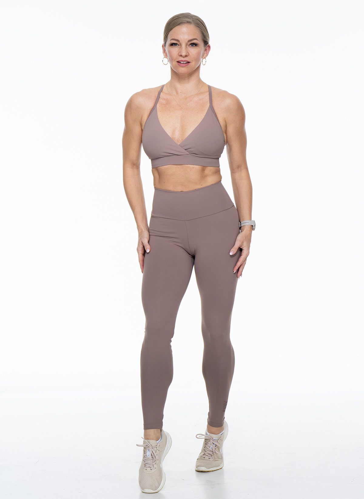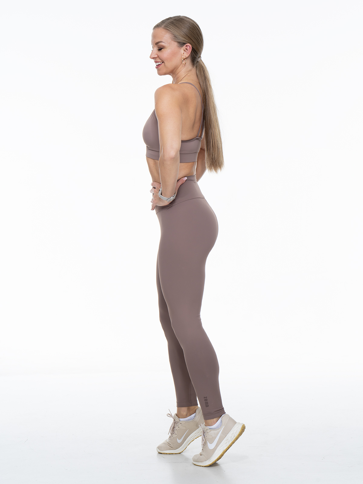 Mogyoróbarna, magas derekú leggings, rugalmas fitnesz anyagból. Nem húzott fenekű. Szépen, finoman leszorítja a hasat, karcsúsítja a derekat.
