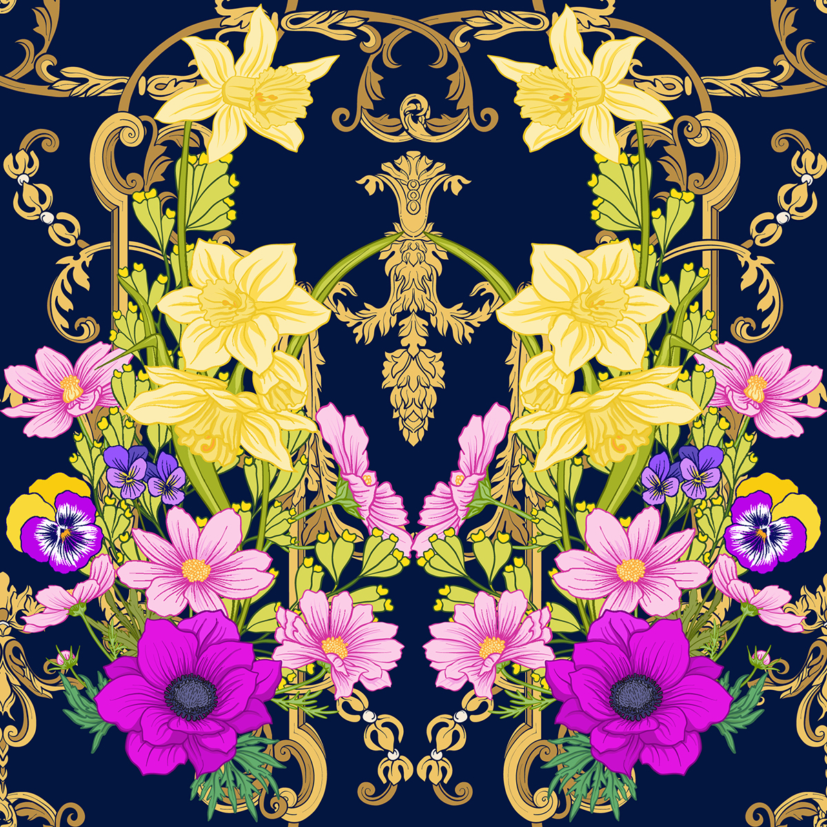 Sötétkék alapon lila, sárga virágminta. Klasszikus, elegáns, nőies.